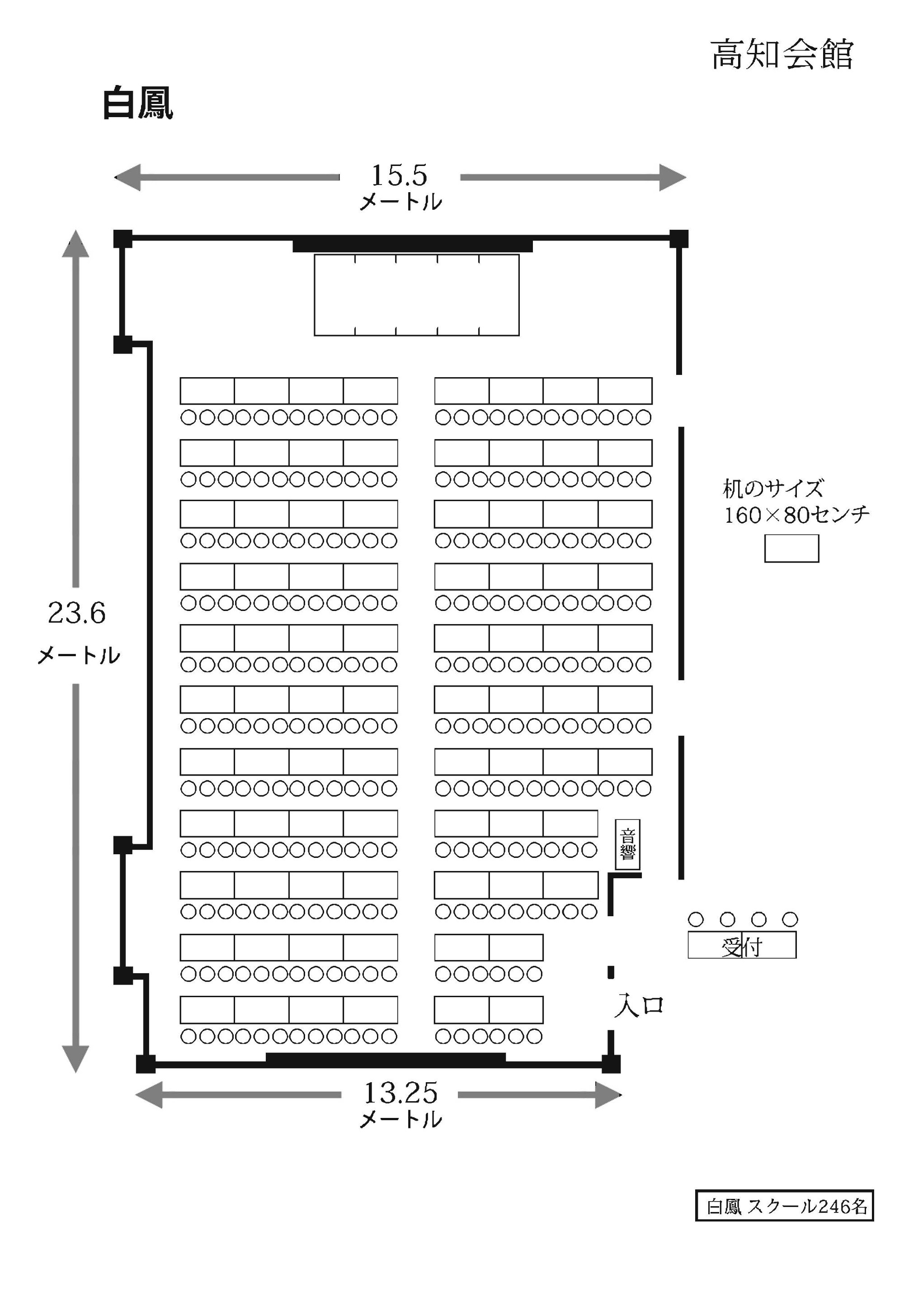 | 会議 収容人数 | 椅子のみ 350名様 スクール 246名様 口の字 96名様 ※テーブルプランにより定員は多少異なります。 |