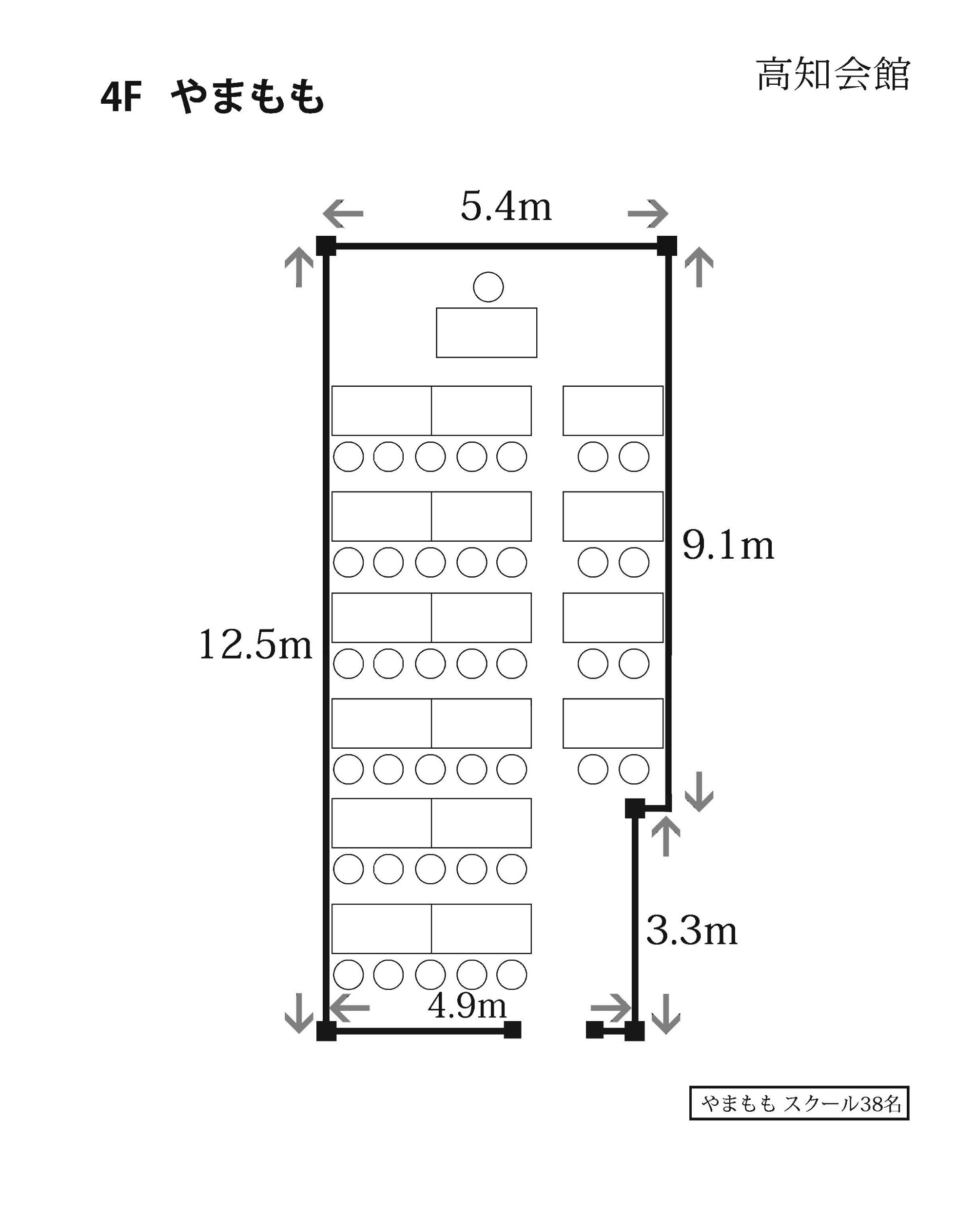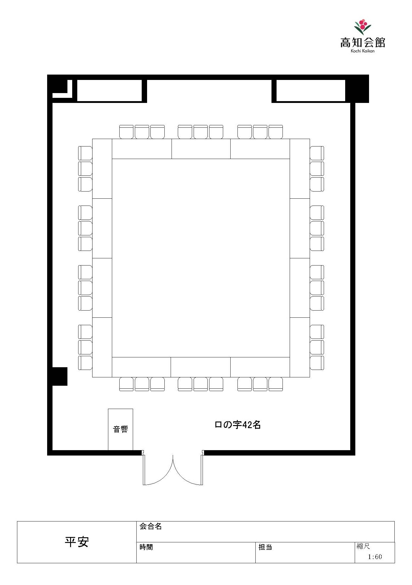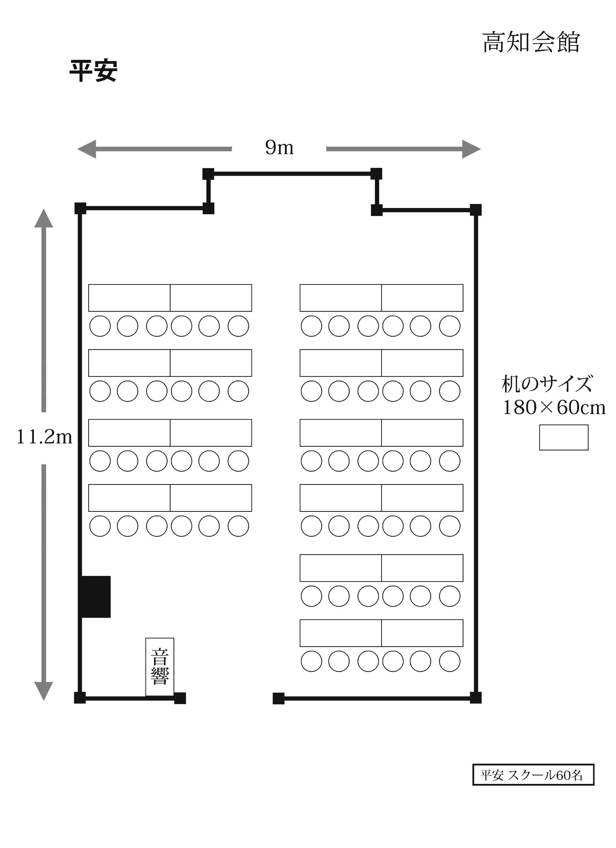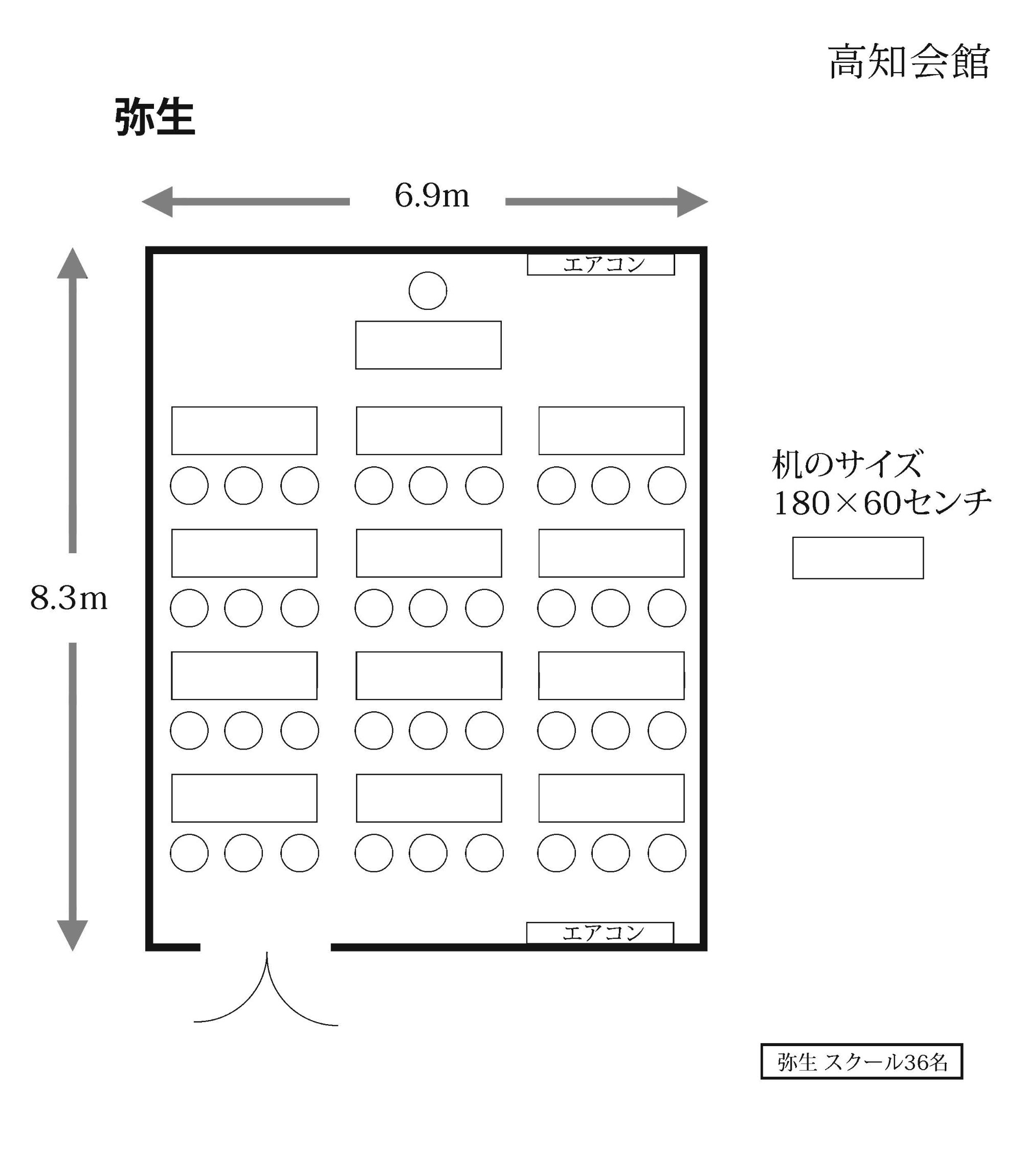 | 会議 収容人数 | スクール 38名様 口の字 36名様 ※テーブルプランにより定員は多少異なります。 |